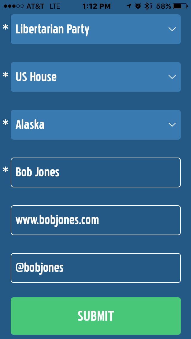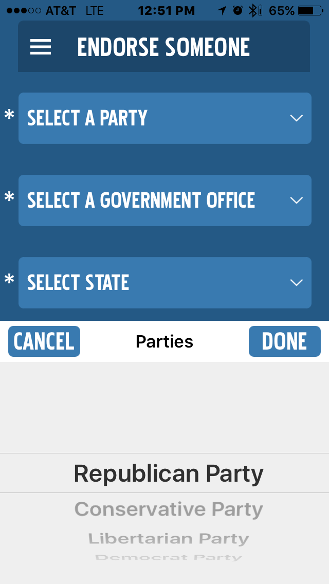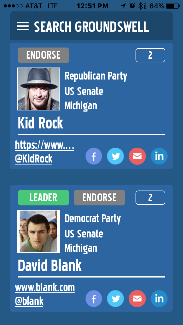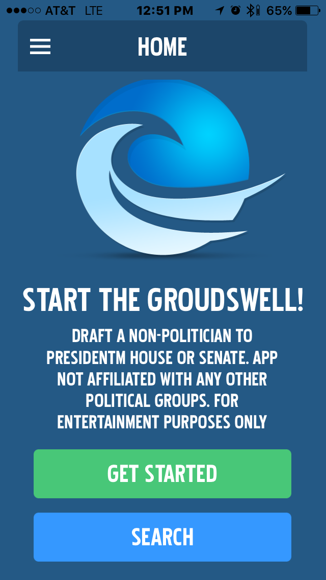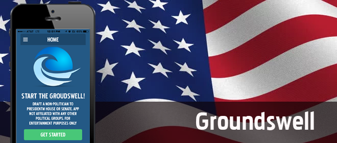 The Groundswell Apps allow users to use social media to encourage people without a political background to run for President, Vice-President, Senate or the House of Representatives. After the submissions are verified by Groundswell, users can search for all submitted candidates and up or down vote these candidates resulting in national and state-level rankings.