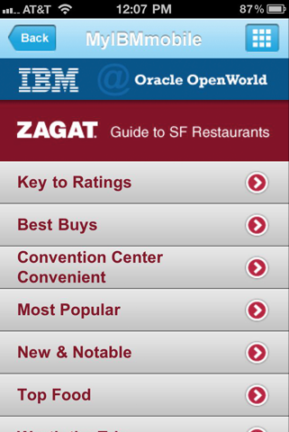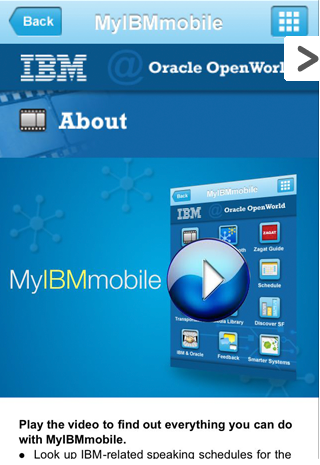 Working in partnership with Somnio Solutions, Inc. (Austin, TX), a creative agency focusing exclusively on high-tech companies, AppsAustin provided a web app solution for IBM. MyIBMMobile.com was created for use during Oracle OpenWorld 2014 to assist attendees with finding and utilizing resources provided by IBM. The app provided Oracle OpenWorld attendees with a video reel for how to utilize the app. The app featured information regarding IBM's booth, a Zagat Guide, Maps to the conference locations and San Francisco, Twitter, Schedule, Transportation, and much more.