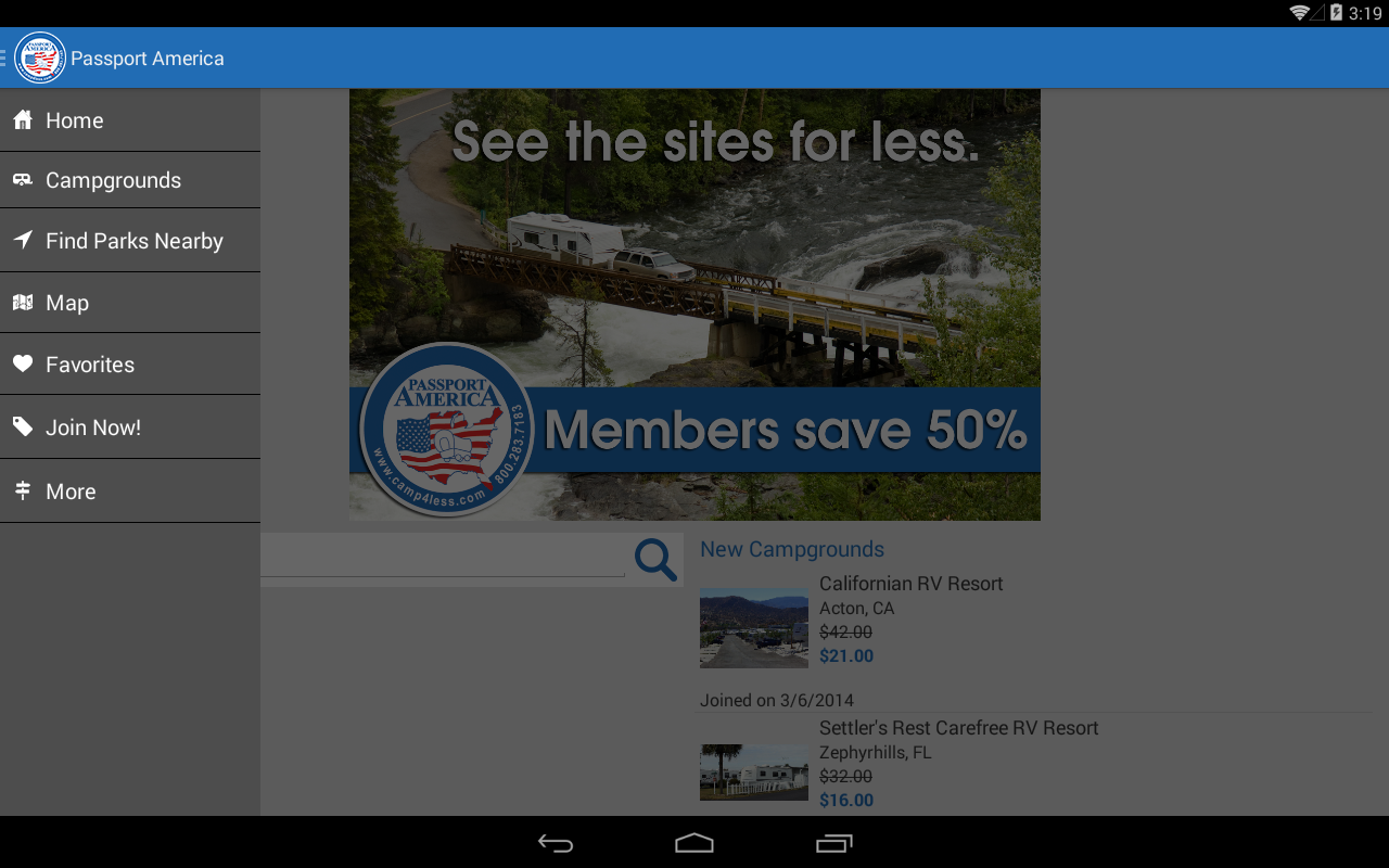 RV Enthusiasts and Campers can all enjoy the benefits of our low cost membership. Our application is available for free to Members of Passport America and non-members who would like to explore our participating campgrounds, however, only Passport America Members can receive the 50% Discount Off of the nightly camping fees.